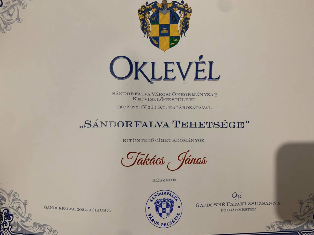 -Büszke vagyok, és megtisztelő, hogy díszpolgári címet kaptam. Sándorfalva az otthonom, nagyon sokat jelent az életemben és egészen biztos vagyok benne, hogy ez is szükséges volt a sikereimhez, a jövőben is szeretném öregbíteni a település hírnevét-mondta Janó a díj átvétele után.